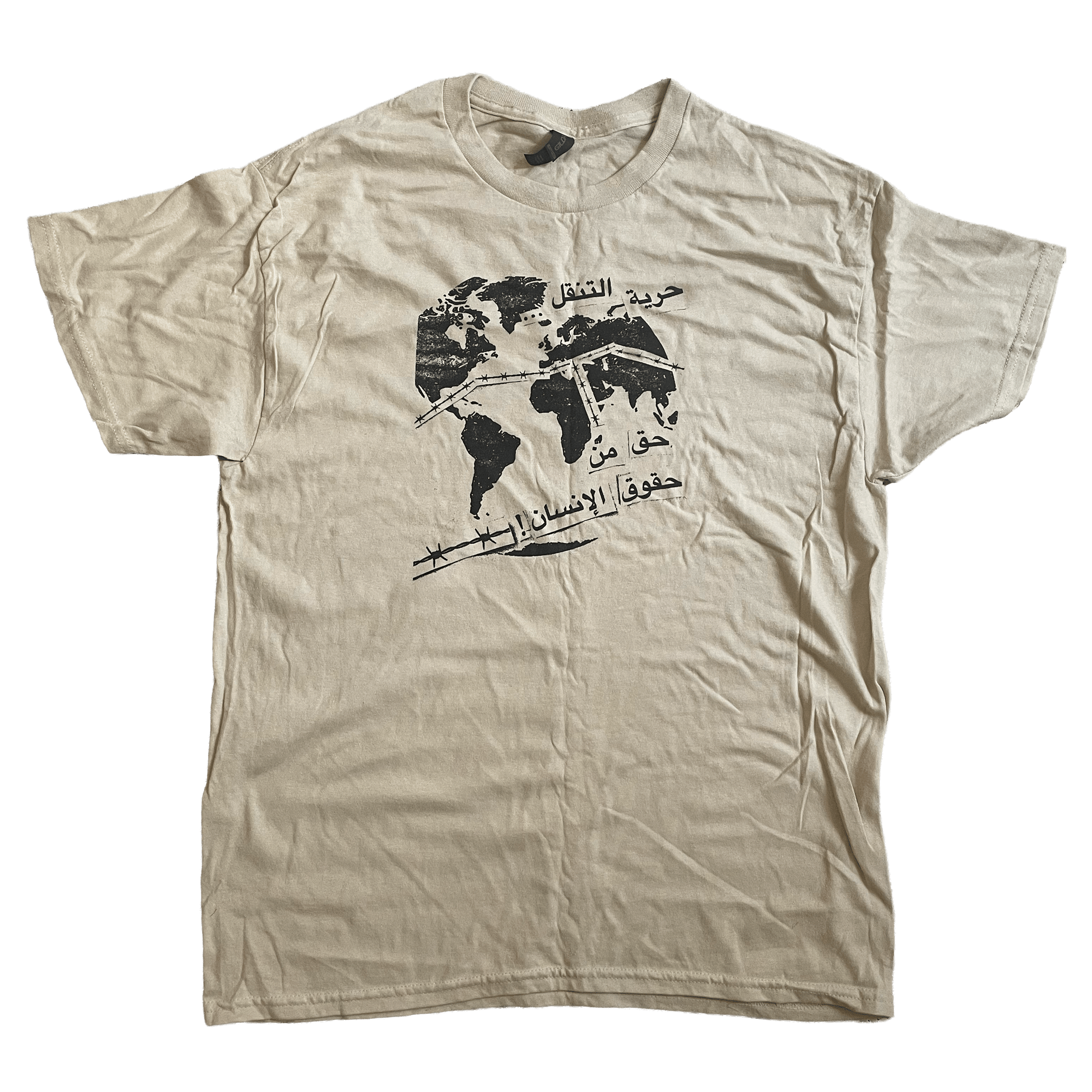 "FREEDOM OF MOVEMENT IS A FUNDAMENTAL HUMAN RIGHT" - screenprinted tees. Black ink on sand tees - GILDAN heavy cotton.